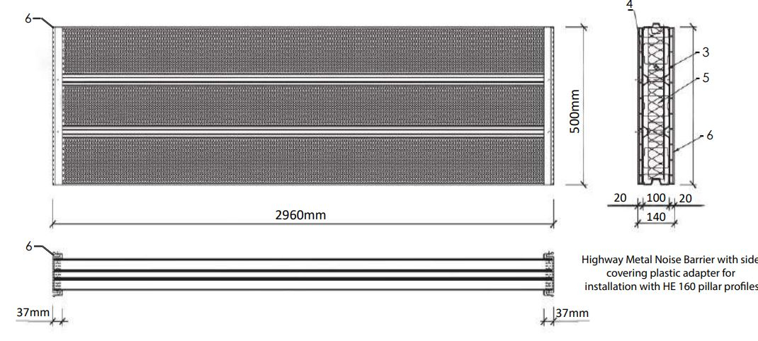 Bariera metalică antifonică pentru autostradă ALPHAfon-HB este fabricată din tablă de aluminiu sau tablă metalică compusă specială (COR-TEN) pe partea exterioară și tablă de aluminiu perforată sau tablă metalică compusă specială perforată (COR-TEN) pe partea sursei de zgomot.
