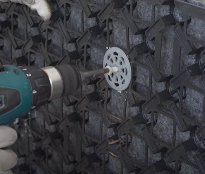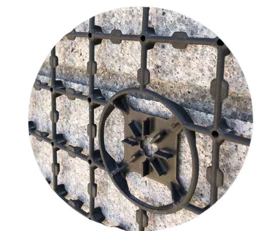 Polistiren Expandat Sinterizat (EPS), in Euroclasa E, echipata cu plasa speciala tridimensionala de sustinere a tencuielii din polipropilena armata, cu zone specifice pregatite pentru fixarea mecanica ulterioara.